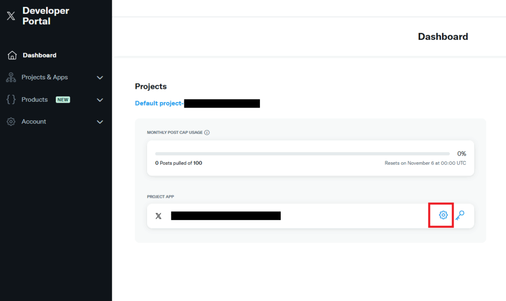 ダッシュボードで「PROJECT APP」の「設定」のアイコンをクリックします。
