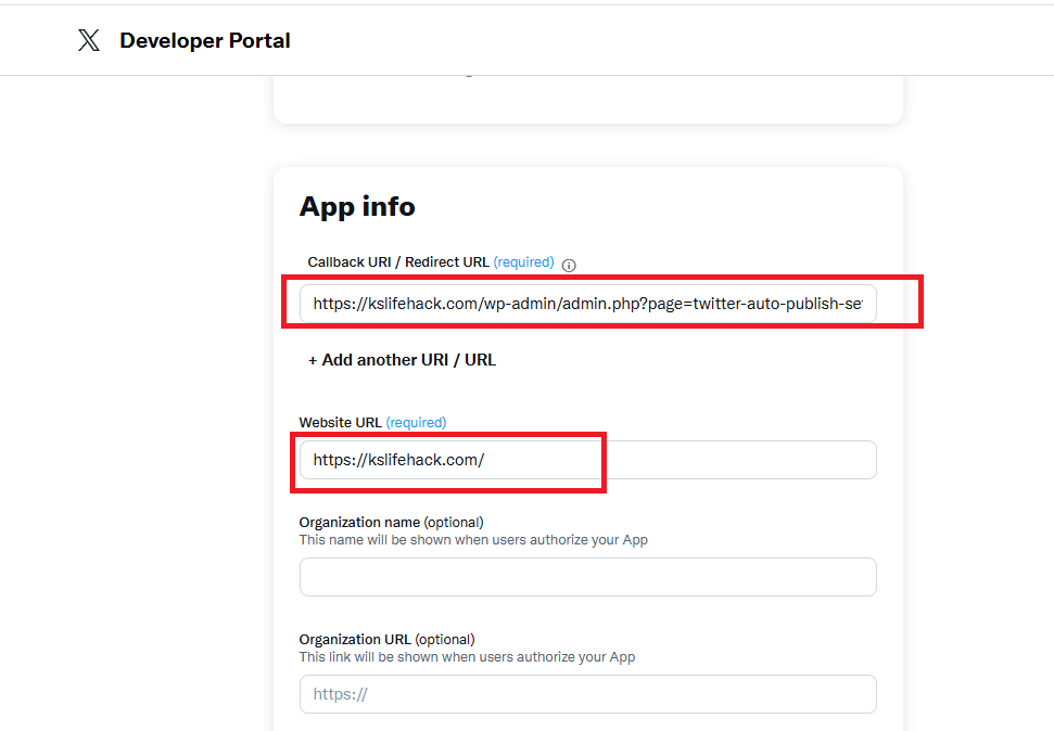 「APP Info」でCallback URI/Redirect URLにWordpressのプラグインに指定されたURLを設定します。