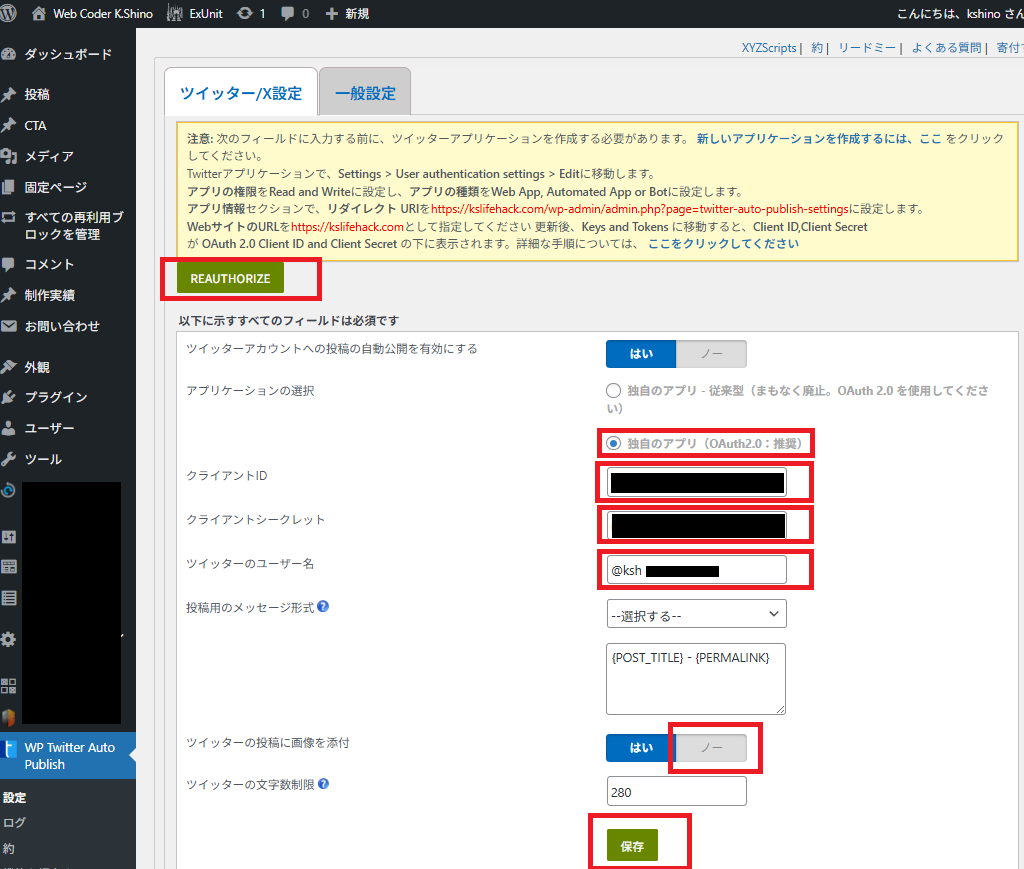 最初、「Social Networks Auto-Poster」を利用しようとしましたがFacebook pageとは連携できましたがXでは新しい認証方式のOAuth2(Open Authorization Ver2)に対応しておらずアクセスエラーとなるのでOAuth2が利用できる「WP Twitter Auto Publish」を利用しました。
