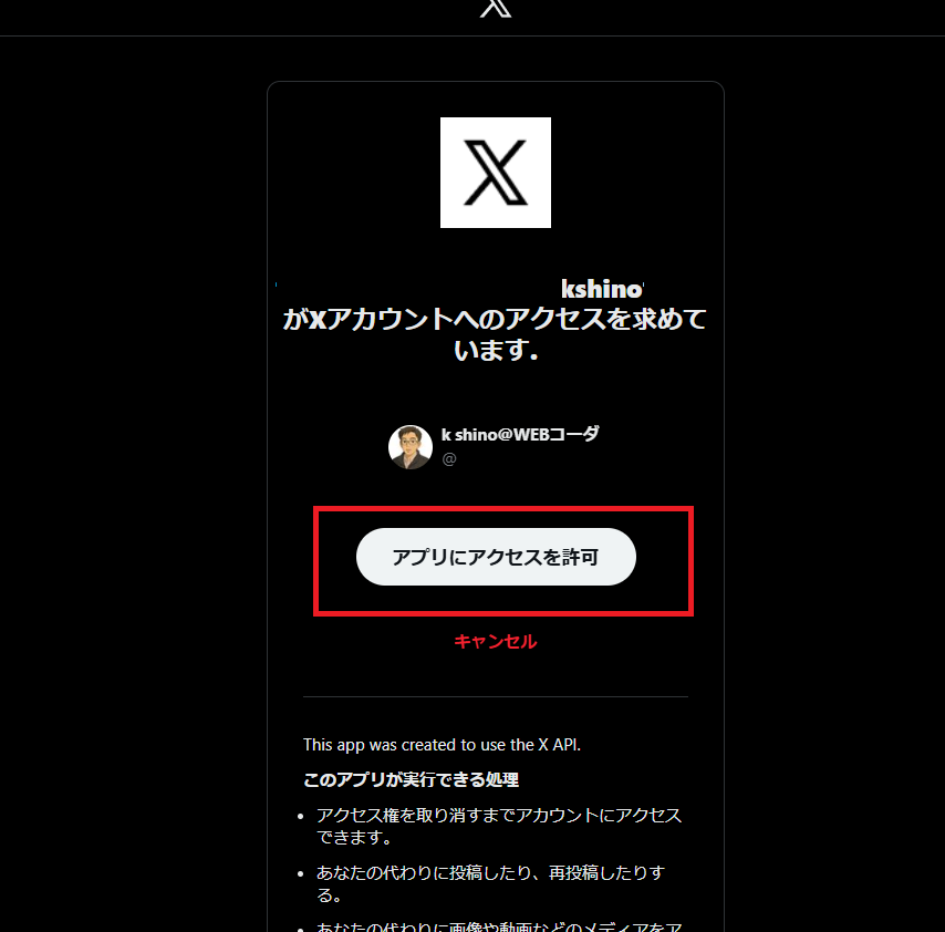 Xに転送されますのでそこで「アプリにアクセスを許可」をクリックしてXへのWordpressからのアクセスを認可します。